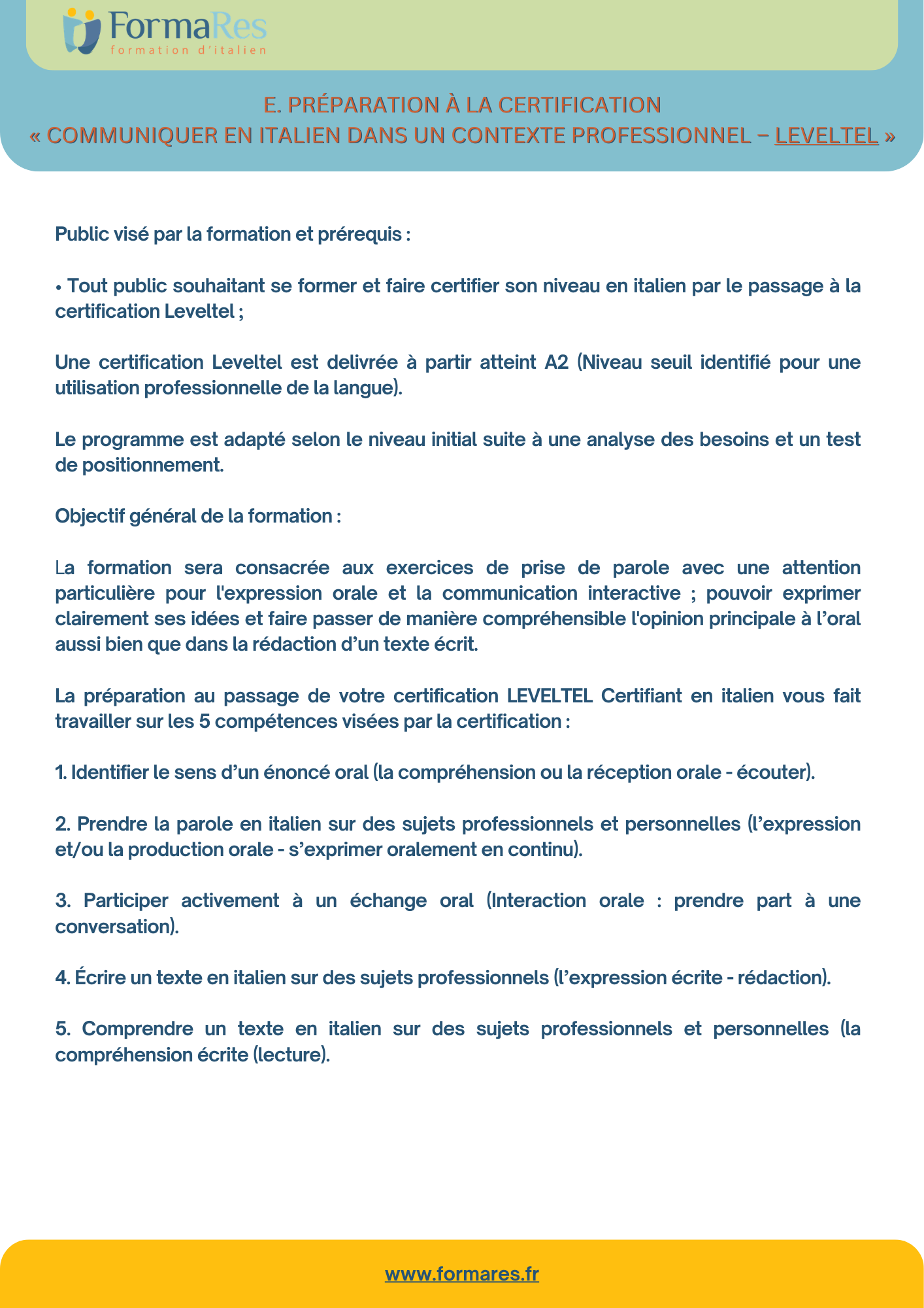 E. Préparation à la certification « Communiquer en italien dans un contexte professionnel – LEVELTEL »